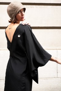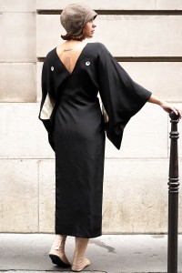 A stunning black kimono dress adorned with delicate white Kamon motifs — part of our exclusive collection of upcycled vintage kimonos.