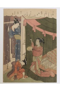 Cette estampe de Shiba Kōkan représente des courtisanes brûlant les moustiques sous la moustiquaire à l'arrivée de leur hôte. Retrait au magasin uniquement.