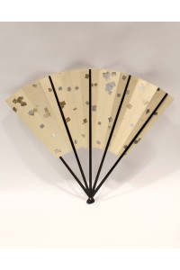 Bel éventail Japonais ancien en papier et bambou laqué, orné d'un magnifique coq peint sur fond doré d'un côté, parsemé de paillettes de papier métallisé or et argent de l'autre.
