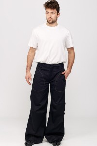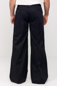 Emblématique de notre marque, le pantalon « à plis aux genoux » est un modèle ample, taille basse, ajusté aux hanches et évasé en bas. Il se porte très long.