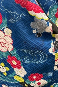 Celui-ci est en soie damassée bleue, illustrée de charmants bouquets. Ses manches Furisode, très longues, lui apportent grâce et élégance.